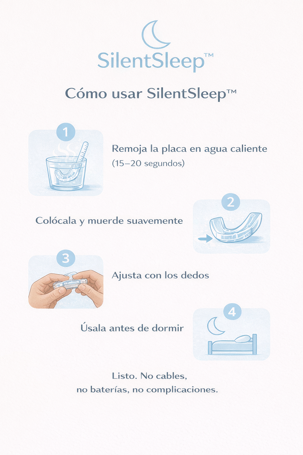 SilentSleep™ utiliza un sistema de ajuste térmico (“Hierve & Muerde”). Solo necesitas agua caliente para moldearla a la forma exacta de tu boca, logrando un ajuste personalizado