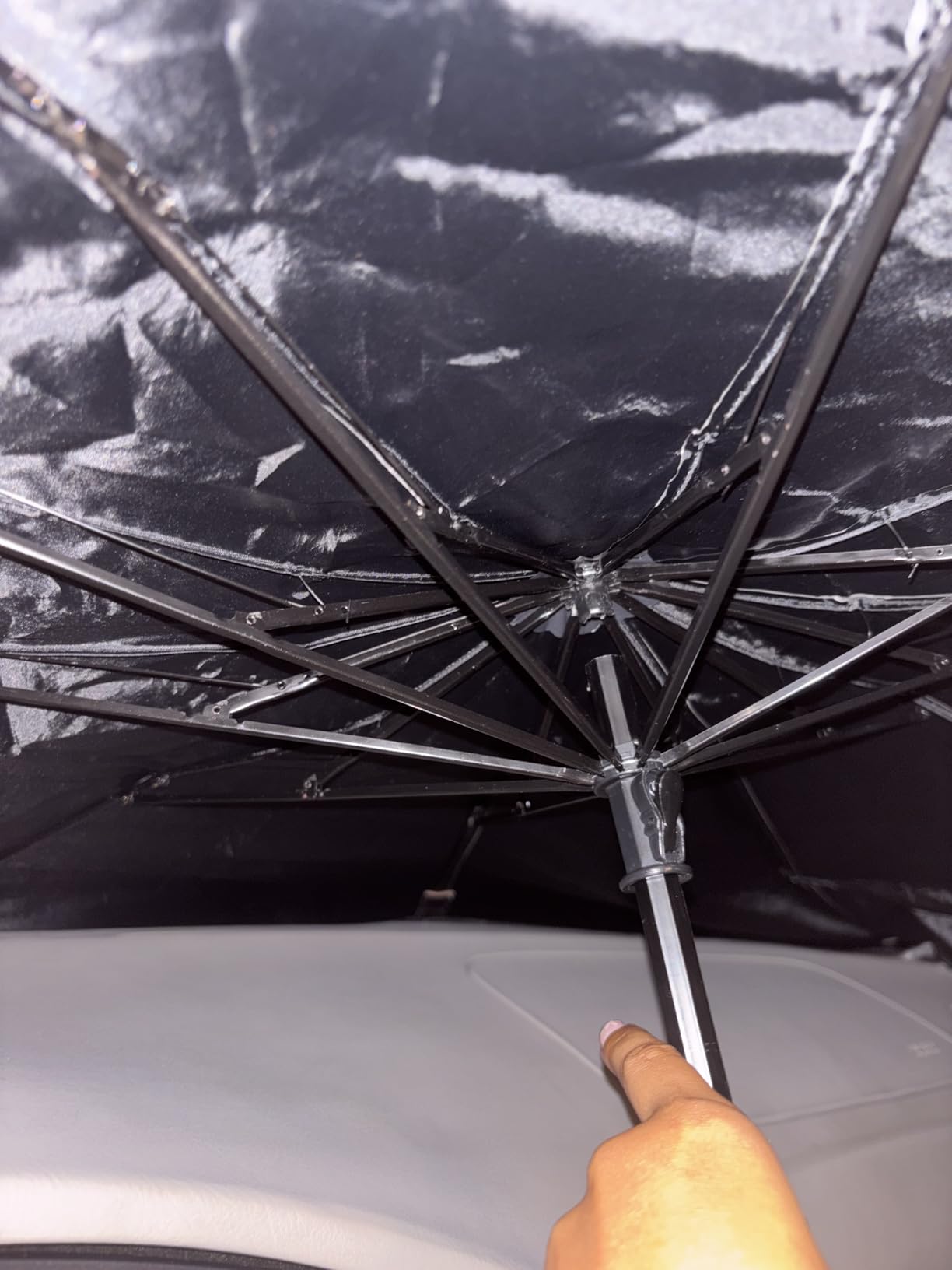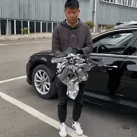 Su diseño retráctil tipo paraguas combina practicidad y durabilidad. Se ajusta perfecto, no se resbala y refleja hasta el 99% del calor solar.
